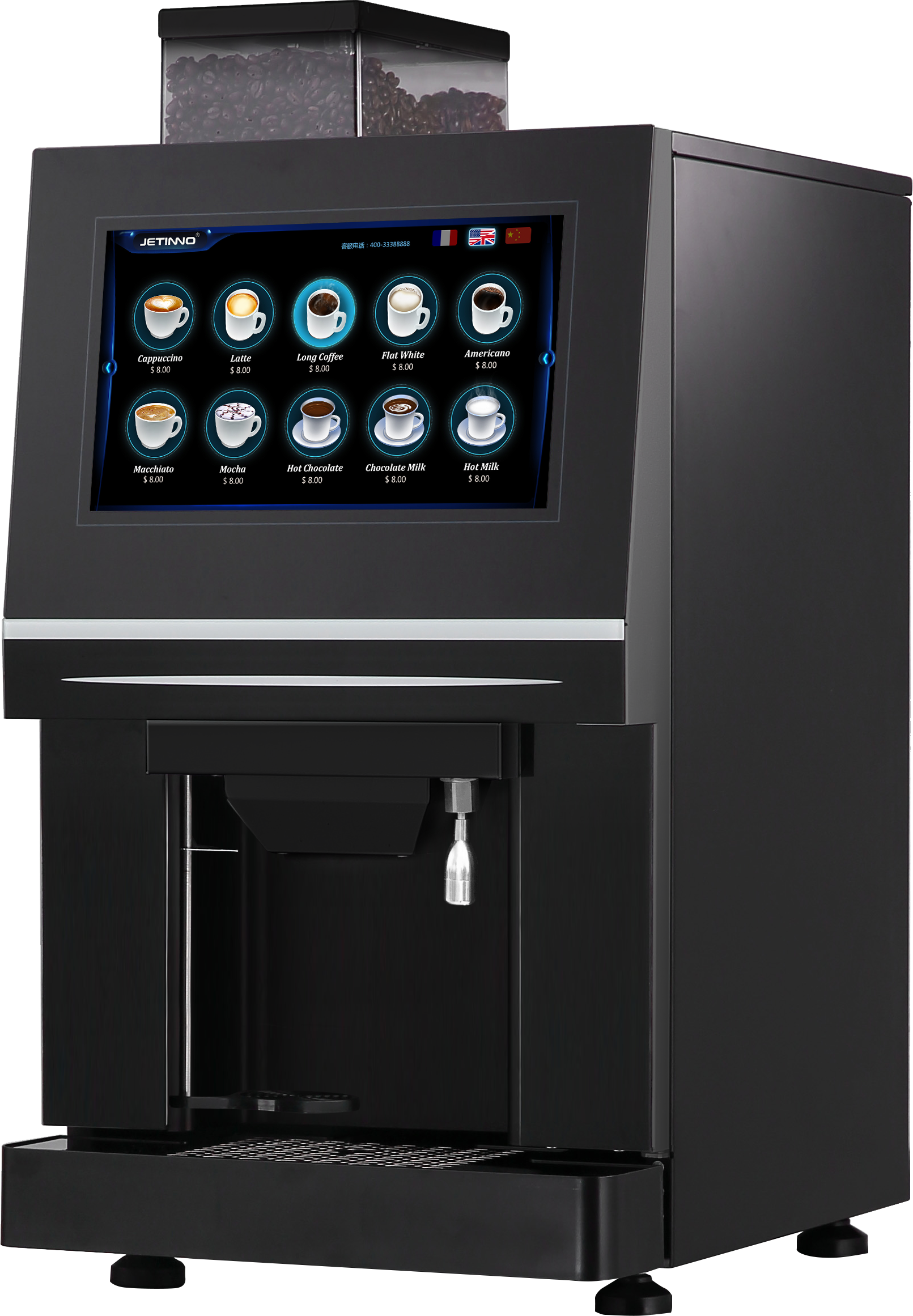 Jetinno JL26 helbønneautomat med kakao, mælkepulver, sukker og varmt vand, så den kan lave mange forskellige drikke. Automaten tager ca. 40 sek. om at lave en kop kaffe. Kaffemaskinen er med 14” touchskærm. Dagligt udlevering 250 kopper. Grumsespanden skal tømmes efter 80 kopper kaffe. Der sidder varmelegeme i kaffebryggeren, så kaffen holdes varm hele vejen. Kaffekværnen er en Ditting EMH64, som er en meget god og stærk kværn. Kaffebeholder på 1,5 kg. Og instant beholdere på 2L. Pr. stk.
