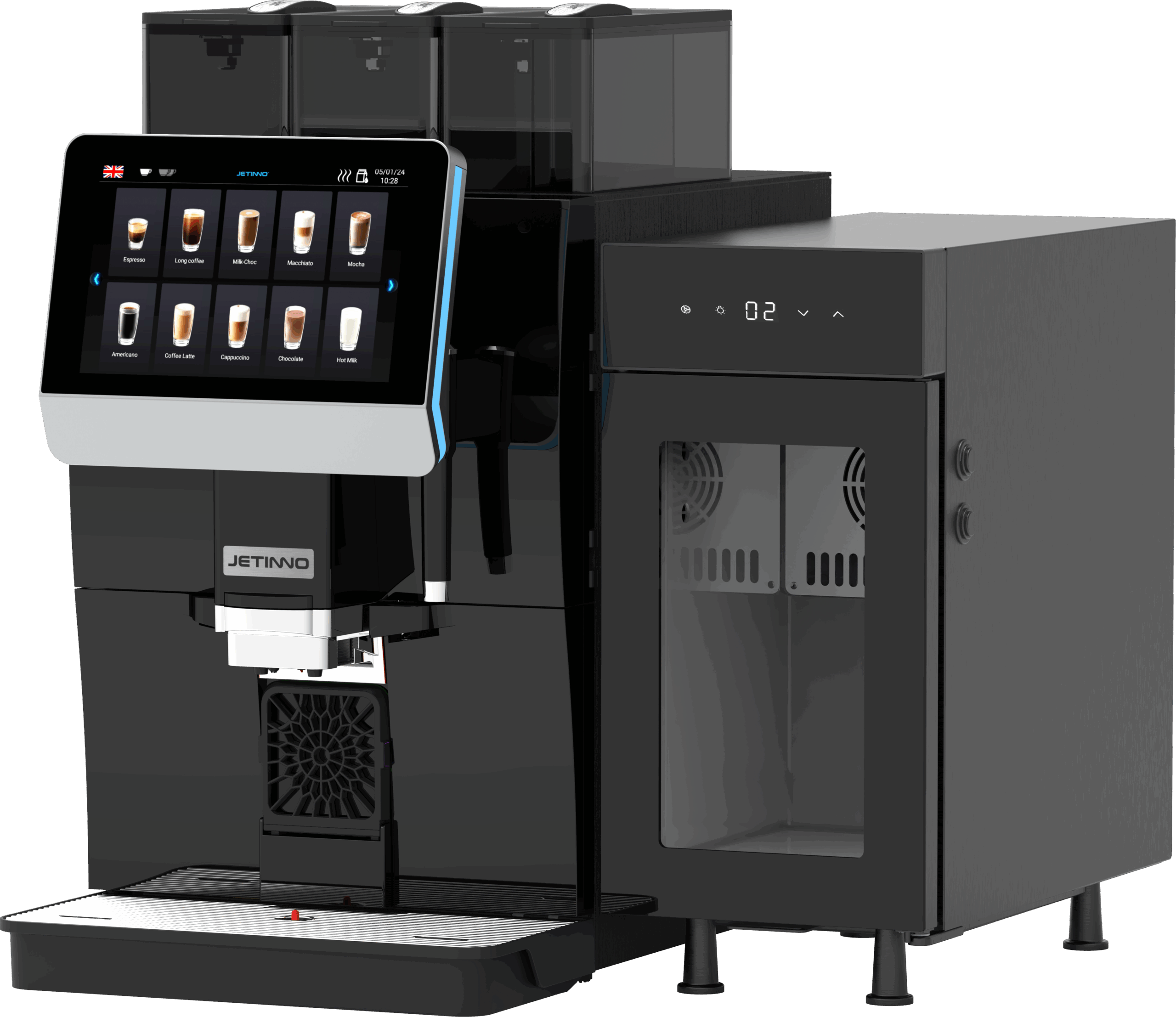 Jetinno JL33 Helbønneautomat med friskmælk og kakao – sukker og varmt vand, så den kan lave mange forskellige drikke. Automaten tager ca. 30 sek. om at lave en kop kaffe. Kaffemaskinen er med 10,1” touchskærm. Dagligt udlevering 200 kopper. Grumsespanden skal tømmes efter 40 kopper kaffe. Der sidder varmelegeme i kaffebryggeren, så kaffen holdes varm hele vejen. 2 x Kaffebeholder på 1kg. Og instant beholdere på 1 x 2L + 1 x 1.5L .