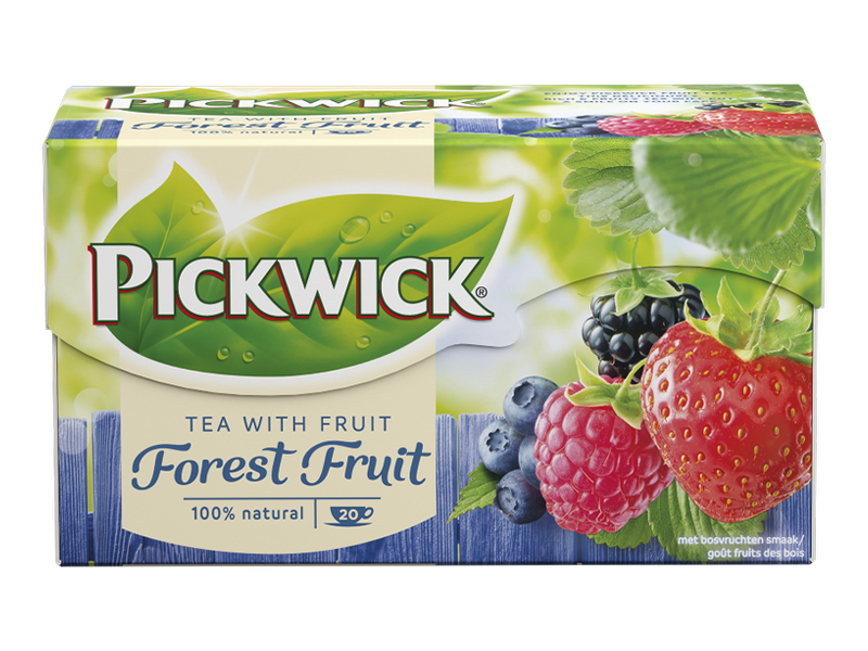 Sort te med frugtstykker af blåbær, brombær, hindbær og jordbær.