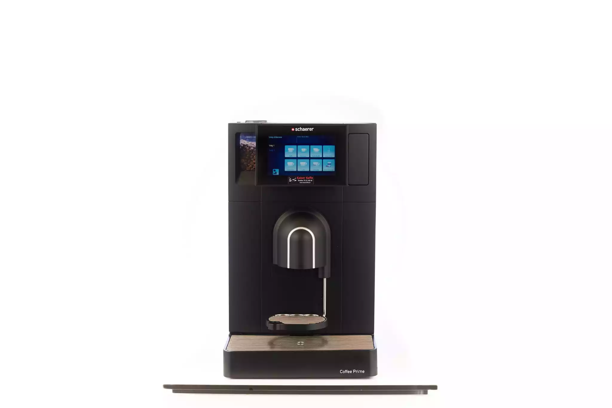 Schaerer Prime er en kaffeautomat med Helebønner, kakaopulver og mælkepulver. Kaffeautomaten kan lave en kop ad gangen. Automaten kan lave op til 16 forskellige drikke. Den fået til manuelt vand, hvor man selv fylder vand på, eller man kan tilslutte den til fast vand. Mål: B 34 x D 54 H 56 cm